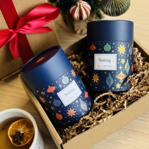 Drugim elementem zestawu jest herbata Świąteczny Grzaniec w eleganckiej tubie– rozgrzewająca mieszanka hibiskusa, owoców i korzennych przypraw, która idealnie oddaje klimat zimowych wieczorów. Aromat jabłka, pomarańczy, goździków i cynamonu natychmiast przywołuje atmosferę świąt.